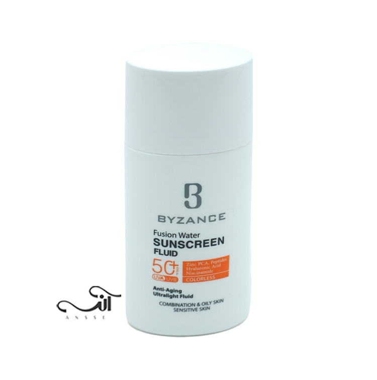 فلوئید ضد آفتاب فیوژن واتر بیزانس، دارای SPF 50 و فیلترهای شیمایی نور خورشید